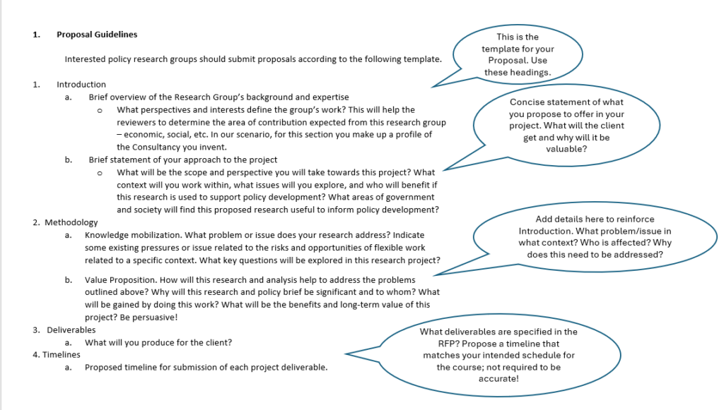 As you complete these readings, consider the following questions: Reflect on the term “knowledge mobilization.” For this course project, what kind of knowledge mobilization are you being asked to do? What is the implied purpose of the knowledge mobilization? Why would it be valuable to generate and share new knowledge and ideas on the topic of flexible work to help decision makers make social, economic and political policy? What might be the value proposition for your specific project? Who will benefit if you do your research and make recommendations? What kind of new knowledge or way of thinking do you want to research and promote? What contribution are you hoping to make? Take a few minutes to review the template for the Proposal provided in the RFP for the course project. Aim to identify the areas of the proposal template where you can highlight the value proposition of your project. |
